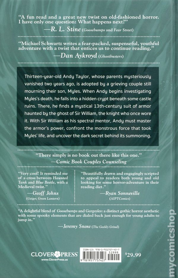 1st printing. Written by Michael Schwartz. Art by Ismael Hernandez. Cover by Francesco Tomaselli. Andy found a haunted suit of armor. Now hes got a ghostly knight as a partner and a terrifying evil to stop before its too late! Sword in the Stone meets Stranger Things in this spine-tingling adventure that is packed with supernatural chills, horrifying monsters, and a hilarious out-of-time ghost that R.L. Stine calls, A fun read and a great new twist on old-fashioned horror.Written by Michael Schwartz (Netflixs Gnome Alone) and lavishly illustrated by Ismael Hernández. This deluxe hardcover of 2024s surprise hit series features a brand-new cover by artist Francesco Tomaselli, collects issues #1-5, includes a 10-page bonus story, and contains a stunning cover gallery with art by Jae Lee, David Mack, Becky Cloonan, Chrissie Zullo, Trevor Henderson, and more!Thirteen-year-old Andy Taylor, whose parents mysteriously vanished two years ago, is adopted by a grieving couple still mourning their son, Myles. When Andy begins investigating Myless death, he falls into a hidden crypt beneath some castle ruins. There, he finds a mystical 13th-century suit of armor haunted by the ghost of Sir William, the knight who once wore it. With Sir William as his spectral mentor, Andy must master the armors power, confront the monstrous force that killed Myles, and uncover the dark secret behind its summoning. Hardcover, 192 pages, full color. NOTE: Beautifully drawn and engagingly scripted – AIPTComicsA fear-packed, suspenseful, youthful adventure – Dan Aykroyd (Ghostbusters)A very good comic from start to finish – Comics BeatBest surprise comic of 2024. There is simply no book out there like this one – Comic Book Couples CounsellingA delightful blend of Goosebumps and Gargoyles – The Geekly GrindA smart, fun read – Tim Sheridan (Masters of the Universe)A thoroughly gripping amalgam of mystery, humor, tragedy and adventure – Comic Book KeepersThe perfect balance between fun and thrills – Badaboom PodcastA standout comic – Nerd Initiative Cover price $29.99.