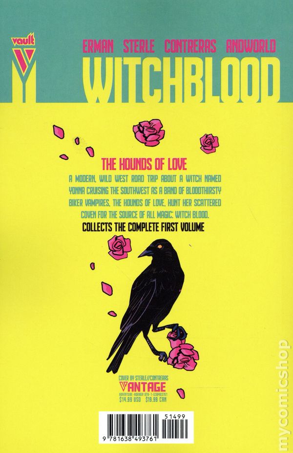 1st printing. Collects Witchblood (2021 Vault Comics) #1-10. Written by Matthew Erman. Art and cover by Lisa Sterle. Widely regarded as one of the best comic books of the decade—garnering glowing reviews from Publisher's Weekly, AV Club, Thrillist, Geek Network, and more—Witchblood: Compact, Book 1 collects issues #1-#10 of the bestselling series. A modern, Wild West road trip about a witch named Yonna cruising the Southwest as a band of bloodthirsty biker vampires, The Hounds of Love, hunt her scattered coven for the source of all magic: witch blood. Softcover, 5 1/2-in. x 8 1/2-in., 256 pages, full color. Cover price $14.99.
