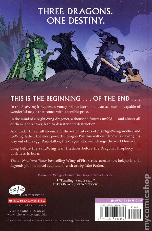 1st printing. Based on the Story by Tui T. Sutherl. Adapted by Barry Deutsch. Art and cover by Jake Parker. The graphic novel adaptations of the #1 New York Times bestselling Wings of Fire series continue to set the world on fire! Three dragons. One unavoidable, unpredictable destiny. This is the beginning...of the end. In the SeaWing kingdom, a young prince learns he is an animus—capable of wonderful magic that comes with a terrible price. In the mind of a NightWing dragonet, a thousand futures unfold—and almost all of them, she knows, lead to disaster and destruction. And under three full moons and the watchful eyes of his NightWing mother and IceWing father, the most powerful dragon Pyrhhia will ever know is clawing his way out of his egg: Darkstalker, the dragon who will change the world forever. Long before the SandWing war, lifetimes before the Dragonet Prophecy...darkness is born. The #1 New York Times bestselling Wings of Fire series soars to new heights in this Wings of Fire: Legends graphic novel adaptation, with art by Jake Parker. Softcover, 6-in. x 9-in., 256 pages, full color. Cover price $14.99.