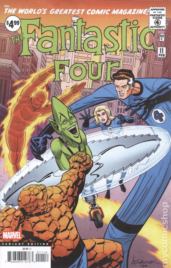 Limited 1 for 25 Retailer Incentive Variant Cover. (W) Stan Lee (A) Jack Kirby (CA) Alex Saviuk Continuing a facsimile collection of the foundational adventures of Marvel's First Family! The FF have survived some dangerous foes in the early days of their super-heroic careers, but nothing could prepare them to face…the Impossible Man! But first, they must deal with the queries from their many fans -courtesy of Willie Lumpkin's bulging mail bag! Then, at last, from planet Poppup in the tenth galaxy, he arrives! He's invincible! Irrepressible! And downright Impossible! Can even the combined talents of Mister Fantastic, the Invisible Girl, the Human Torch and the Thing find a way to contain him?! It's one of the all-time great Marvel comic books, boldly re-presented in its original form, ads and all! Reprinting FANTASTIC FOUR (1961) #11. Cover price $4.99.