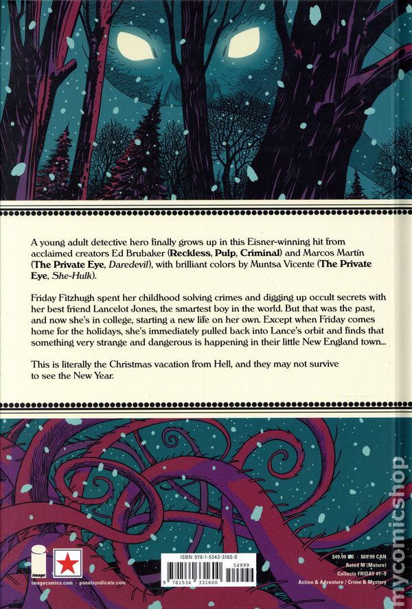 1st printing. Collects Friday TPB (2021-2024 Image) Vol. 1-3. Written by Ed Brubaker. Art by Marcos Martin and Muntsa Vicente. Cover by Marcos Martin. Yellowjackets meets The Chilling Adventures of Sabrina in this genre-defying, post-YA masterpiece, now collecting all three volumes in one deluxe hardcover! Friday Fitzhugh spent her childhood solving crimes and digging up occult secrets with her best friend Lancelot Jones, the smartest boy in the world. But that was the past. Now she's in college, starting a new life on her own. Except, when Friday comes home for the holidays, she's immediately pulled back into Lance's orbit and finds that something very strange and dangerous is happening in their little New England town... This is literally the Christmas vacation from Hell, and neither of them may survive to see the New Year. From multiple Eisner award-winning creators ED BRUBAKER (CRIMINAL, RECKLESS, KILL OR BE KILLED) and MARCOS MARTÍN (THE PRIVATE EYE, Daredevil), with brilliant colors by MUNTSA VICENTE, FRIDAY is a chilling coming-of-age story about growing up, letting go, and uncovering the darkness hidden in familiar places. Hardcover, 368 pages, full color. Mature Readers Cover price $49.99.