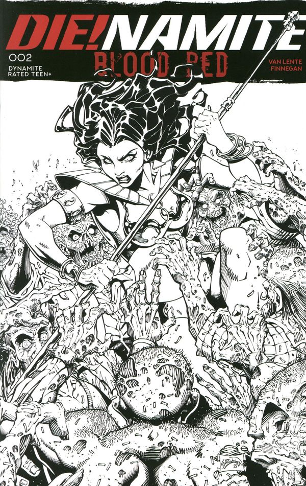 Limited 1 for 7 Retailer Incentive Variant Cover.(W) Fred Van Lente (A) Marco Finnegan (CA) Will Robson SAVIORS FROM MARS? Welcome back to Sunset City — where the boys crave brains and the girls are pretty! Having blown off a meeting with world-weary private investigator Vampirella, the fortified citys iron-fisted ruler Purgatori now summons the Daughter of Drakulon to translate for a visitor whos just crashed her saucer on the outskirts of town. Vampi doesnt speak Martian, but the telepathic Dejah Thoris is quick to pick up the local tongue — and the news she brings is a bombshell. If Dejahs story checks out, the cure to the all-male zombie plague is within Puragoris grasp — she just needs to motivate Vampirella to hand it over after she finds it! The unquiet spirits of FRED VAN LENTE and MARCO FINNEGAN haunt the living reader through the unwholesomely compelling pages of Die!namite: Blood Red #2 — featuring shamblingly chic covers from EJ SU, ROBERTO MELI, DAVID COUSENS, and WILL ROBSON! 32 pages, full color, rated teen+ Cover price $4.99.