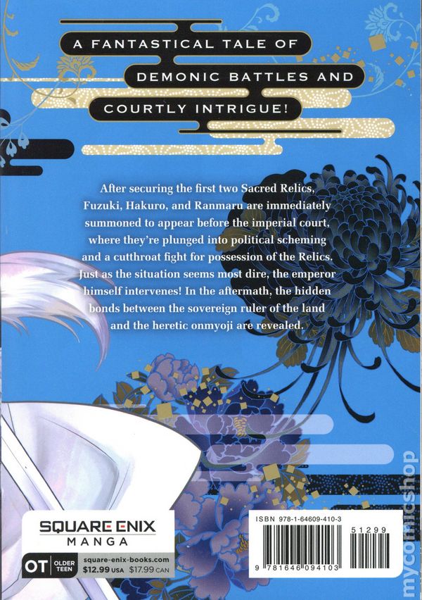 Volume 2 - 1st printing. Story and art by Sakura Fujimoto. Translated by Jan Mitsuko Cash. In this fantastical tale of demonic battles and courtly intrigue, an onmyoji known as the Heretic faces a destiny that could overturn both the human and demon realms! After securing the first two Sacred Relics, Fuzuki, Hakuro, and Ranmaru are immediately summoned to appear before the imperial court, where theyre plunged into political scheming and a cutthroat fight for possession of the Relics. Just as the situation seems most dire, the emperor himself intervenes! In the aftermath, the hidden bonds between the sovereign ruler of the land and the heretic onmyoji are revealed. Softcover, 5-in. x 7-in., 192 pages, B&W. Rated T+ Cover price $12.99.