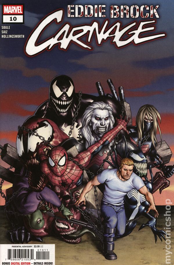(W) Charles Soule (A) Jesus Saiz (CA) Jesus Saiz THE DEATH OF CARNAGE?! Eddie and Carnage's investigation has hardly gone as planned, leaving them at the whims of its mysterious proprietor - a symbiote host Eddie remembers from his days as the King in Black. She has the key to killing Carnage, but the price of ridding the world of him once and for all is costly. Will Eddie be willing to pay it, or will the symbiote live to kill another day? RATED PARENTAL ADVISORY. 32 pages, full color, rated parental advisory. Cover price $3.99.