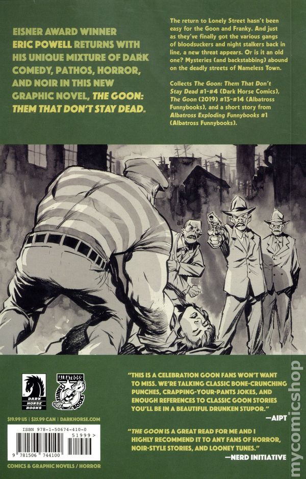 1st printing. Collects Goon: Them that Don't Stay Dead (2024 Dark Horse) #1-4. Story and art by Eric Powell. To mark the 25th anniversary of The Goon, Eisner Award-winner Eric Powell returns with an all-new tale! A brand new black and white horror graphic novel filled with Powell's brand of humor. The return to Lonely Street hasn't been easy for the Goon and Franky. And just as they've finally got the various gangs of blood suckers and night stalkers back in line, a new threat appears. Or is it an old one? Mysteries (and backstabbing) abound on the deadly streets of Nameless Town. Bonus content includes a sketchbook and cover gallery! Softcover, 176 pages, PC/PB&W. Cover price $19.99.