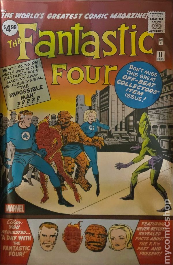 Foil Cover. (W) Stan Lee (A) Jack Kirby (CA) Jack Kirby Continuing a facsimile collection of the foundational adventures of Marvel's First Family! The FF have survived some dangerous foes in the early days of their super-heroic careers, but nothing could prepare them to face…the Impossible Man! But first, they must deal with the queries from their many fans -courtesy of Willie Lumpkin's bulging mail bag! Then, at last, from planet Poppup in the tenth galaxy, he arrives! He's invincible! Irrepressible! And downright Impossible! Can even the combined talents of Mister Fantastic, the Invisible Girl, the Human Torch and the Thing find a way to contain him?! It's one of the all-time great Marvel comic books, boldly re-presented in its original form, ads and all! Reprinting FANTASTIC FOUR (1961) #11. 32 pages, full color, not rated. Cover price $4.99.