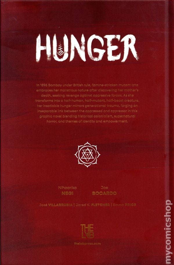 1st printing. Written by Nihaarika Negi. Art by Joe Bocardo. Cover by WOLFSKULLJACK. In 1896 Bombay, under British rule, a concentration camp holds Izna, a plague-infected and famine-stricken being. Mutated through medical experiments, she, along with others, becomes a mutant. British officers invite famine photographer William Wallace Hooper to document the mutants, unaware he's controlled by a shape-shifting vampire called Pisach. The Pisach infects prey with insatiable hunger, while Hooper bonds with Izna amidst rulers' games with famine slaves. Unbeknownst, Izna descends from women embracing monsters. Discovering Hooper's role in her mother's death, she wishes to become a monster herself. Transformed into a half-human, half-mutant, half-beast, she embraces her hunger, consuming oppressors and drenching her land in blood. This infinite hunger mirrors trauma's generational and cultural impact, forging an inseparable link between oppressed and oppressor. This comic-shop exclusive edition features a cover by WOLFSKULLJACK, known for her work on Magic! The Gathering, Metallica, and more! Hardcover, 7-in. x 11-in., 152 pages, full color. Cover price $49.99.