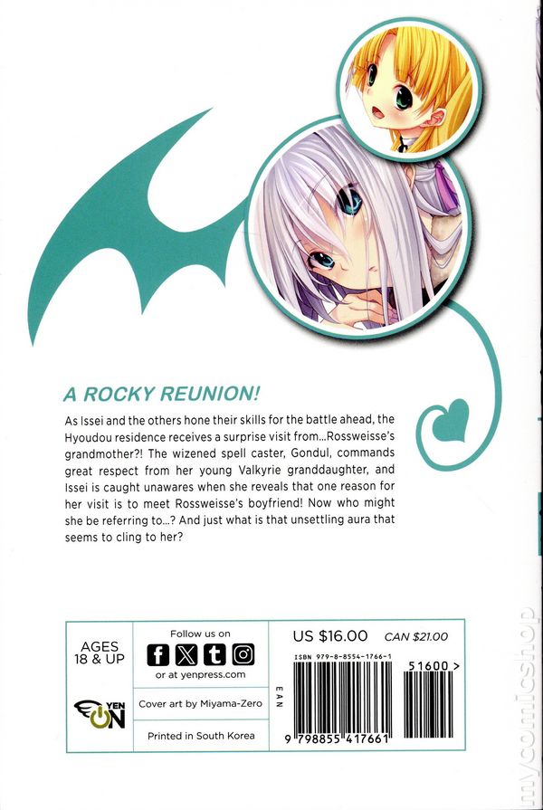 Volume 17 - 1st printing. Written by Ichiei Ishibumi. Art and cover by Miyama-Zero. Translated by Haydn Trowell. As Issei and the others train relentlessly to meet the approaching battle, Rossweisse's grandmother arrives at the Hyoudou residence. Rossweisse has incredible respect for the elderly witch, a living legend, but something about her seems off... Softcover, 5-in. x 7-in., 224 pages Text (with B&W Chapter Illustrations). Mature Readers Cover price $16.00.