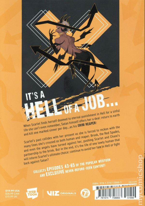 Volume 4 - 1st printing. Written by Graveweaver. Art by Graveweaver and Miranda Mundt. Cover by Graveweaver. Scarlet's past collides with her present as she is forced to reckon with the many lines she's crossed as both human and reaper. Brook, the Red Spades, and even the angels have turned against her, pushing Scarlet and Chase's partnership to the brink. But in the end, it's the life of one lowly human that will inform Scarlet's ultimate choice: continue to avoid her fate in Hell or fight back against Satan? This volume collects episodes 43-65 of the popular WEBTOON and exclusive never-before-seen content! Softcover, 5-in. x 7-in., 320 pages, full color. Rated: T+ (Older Teen) Cover price $18.99.