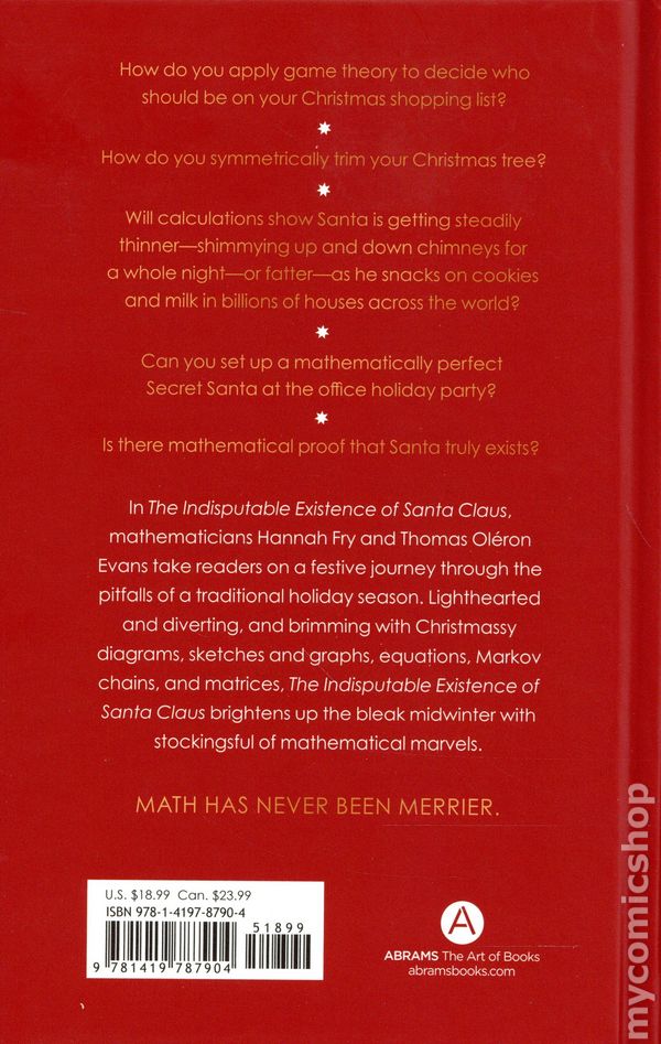 1st printing. Written by Thomas Oleron Evans and Hannah Fry. In The Indisputable Existence of Santa Claus, two distinguished mathematicians explain, with humor and clarity, mathematical concepts through one very merry motif: Christmas. Lighthearted and diverting with Christmasy diagrams, sketches and graphs, equations, Markov chains, and matrices, The Indisputable Existence of Santa Claus brightens up the bleak midwinter with stockings full of mathematical marvels. How do you apply game theory to select who should be on your Christmas shopping list? What equations should you use to decorate the Christmas tree? Will calculations show Santa is getting steadily thinner—shimmying up and down chimneys for a whole night—or fatter—as he munches on cookies and milk in billions of houses across the world? In their quest to provide mathematical proof for the existence of Santa, the authors take readers on a festive journey through a traditional holiday season. Every activity, from wrapping presents to playing board games to cooking the perfect turkey, is analyzed through the lens of math. Because who hasnt always wondered how to set up a mathematically perfect Secret Santa? This book belongs under your Christmas tree if you enjoy a spice of math in your eggnog. Hardcover, 5-in. x 8-in., 160 pages, Text. Teen Cover price $18.99.