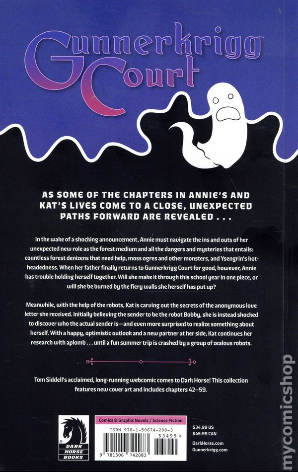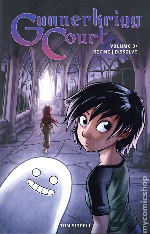 Volume 3 - 1st printing. "Refine/Dissolve!" Collects Gunnerkrigg Court GN (2015-2021 Boom Studios/Archaia) Vol. 5-6. Story and art by Tom Siddell. Tom Siddells acclaimed, long-running webcomic continues in print! This paperback volume features new cover art by Siddell, updated interior art, and includes chapters 42-59 of the beloved sci-fi fantasy. As some of the chapters in Annie and Kats lives come to a close, unexpected paths forward are revealed. In the wake of a shocking announcement, Annie must navigate the ins and outs of her unexpected new role as the forest medium and all the dangers and mysteries that entails: countless forest denizens that need help, moss ogres and other monsters, and Ysengrins hot-headedness. When her father finally returns to Gunnerkrigg Court for good, however, Annie has trouble holding herself together. Will she make it through this school year in one piece, or will she be burned by the fiery walls she herself has put up? Meanwhile, with the help of the robots, Kat is carving out the secrets of the anonymous love letter she received. Initially believing the sender to be the robot Bobby, she is instead shocked to discover who the actual sender is—and even more surprised to realize something about herself. With a happy, optimistic outlook and a new partner at her side, Kat continues her research with aplomb…until a fun summer trip is crashed by a group of zealous robots. Amidst all of this, the girls say goodbye to a dear friend, learn more about the relationship between the Court and the Forest, and prepare for a visit to the Annan Waters that they will never forget. Softcover, 584 pages, full color. Cover price $34.99.