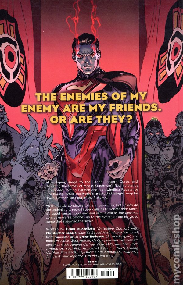 Volume 2 - 1st printing. Collects Injustice: Gods Among Us - Year Four (2014 DC) #1-12 and Injustice Gods Among Us Year Four (2015) Annual #1, Injustice: Gods Among Us - Year Five (2016) #1-20, Injustice: Gods Among Us - Year Five (2016) Annual #1, and Injustice: Gods Among Us - Ground Zero (2016) #1-12. Written by Brian Buccellato, Tom Taylor, and Christopher Sebela. Art by Juan Albarran, Iban Coello, Bruno Redondo, Tom Derenick, Miguel Mendonca, Pop Mhan, Mike S. Miller, Andy Owens, Jheremy Raapack, Derlis Santacruz, Sergio Sandoval, Marco Santucci, Daniel Sampere, Jordi Tarragona, and Xermanic. Cover by David Yardin. Introduction by Brian Buccellato. THE FINAL BATTLES IN THE BRUTAL WAR BETWEEN BATMAN AND SUPERMAN! THE END IS NIGH! Written by Brian Buccellato, Tom Taylor and More Art by Bruno Redondo, Daniel Sampere, Marco Santucci and More After laying siege to the Green Lantern Corps and defeating the forces of magic, Superman's Regime stands unopposed, forcing Batman and his dwindling Resistance into hiding. While the world's greatest strategist may be down, Batman isn't out of the fight yet. As the battle continues to claim casualties, both sides do the unthinkable: recruit super-villains to bolster their ranks. It's good versus good and evil versus evil as the Injustice comics universe catches up to the events of the hit video game that spawned the series! Written by Brian Buccellato (Detective Comics) with Christopher Sebela (Suicide Squad Most Wanted) and Tom Taylor (DCeased), Softcover, 1,064 pages, full color. Teen Cover price $59.99.