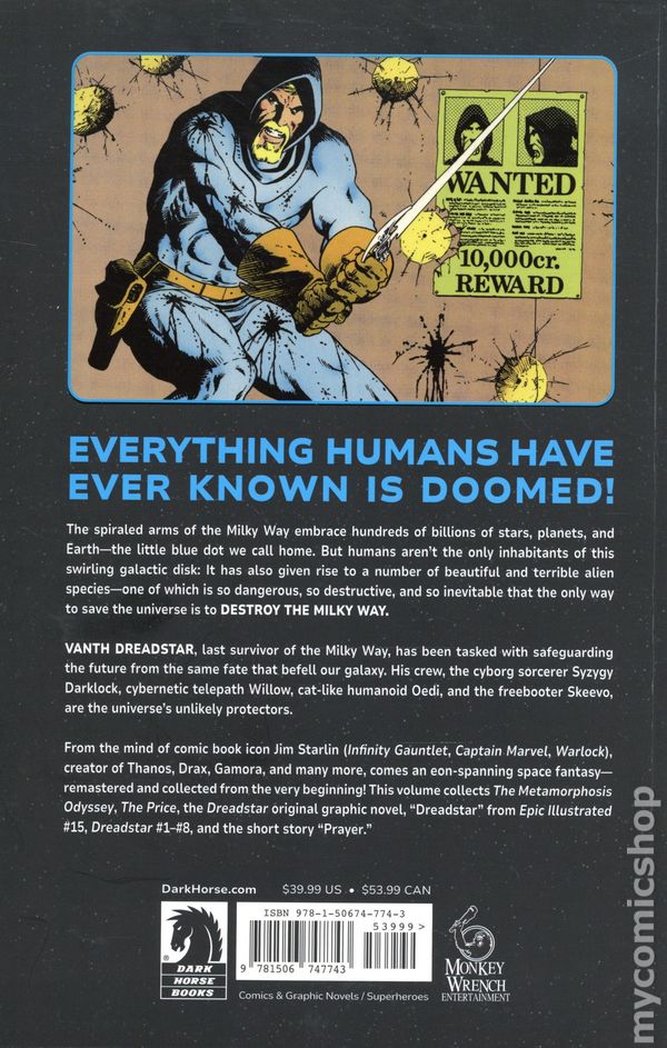 1st printing. Story and art by Jim Starlin. Jim Starlins Space Fantasy Masterpiece! The definitive Dreadstar collection begins here, remastered for a new generation! The spiraled arms of the Milky Way embrace hundreds of billions of stars, planets, and Earth—the little blue dot we call home. But humans arent the only inhabitants of this swirling galactic disc, its also given rise to a number of beautiful and terrible alien species—one of which is so dangerous, so destructive, and so inevitable that the only way to save the universe is to DESTROY THE MILKY WAY. Vanth Dreadstar, last survivor of the Milky Way, has been tasked with safeguarding the future from the same fate that befell our galaxy. His crew, a cyborg sorcerer Syzygy Darklock, cybernetic telepath Willow, cat-like humanoid Oedi, and the freebooter Skeevo, are the universes unlikely protectors. From the mind of comics icon Jim Starlin (Infinity Gauntlet, Captain Marvel, Warlock), creator of Thanos, Drax, Gamora, and many more, comes an eon-spanning space fantasy—remastered and collected from the very beginning in this, the first of three definitive tomes! This volume collects the Metamorphosis Odyssey, The Price, Dreadstar GN (1982 Marvel Graphic Novel), Epic Illustrated #15, Dreadstar (1982-1986 Marvel/Epic) #1-8, and the short story Prayer. Softcover, 512 pages, PC/PB&W. Cover price $39.99.