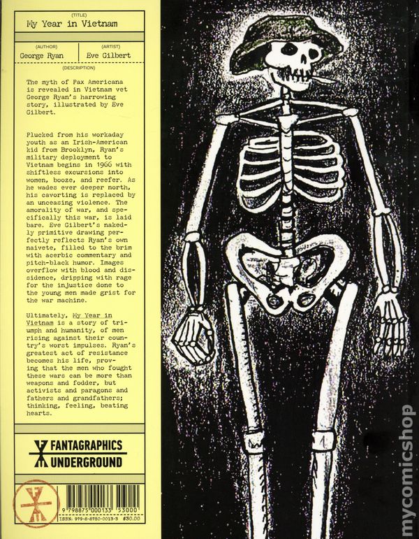 1st printing. Written by George Ryan. Art and cover by Eve Gilbert. Plucked from his workaday youth as an Irish-American kid from Brooklyn, Ryans military deployment to Vietnam begins in 1966 with shiftless excursions into women, booze, and reefer. As he wades ever deeper north, his cavorting is replaced by an unceasing violence. The amorality of war, and specifically this war, is laid bare. Eve Gilberts nakedly primitive drawing perfectly reflects Ryans own naivete, filled to the brim with acerbic commentary and pitch-black humor. Images overflow with blood and dissidence, dripping with rage for the injustice done to the young men made grist for the war machine. Ultimately, My Year in Vietnam is a story of triumph and humanity, of men rising against their countrys worst impulses. Ryans greatest act of resistance becomes his life, proving that the men who fought these wars can be more than weapons and fodder, but activists and paragons and fathers and grandfathers; thinking, feeling, beating hearts. Softcover, 8-in. x 10-in., 136 pages, PC/PB&W. Mature Readers Cover price $30.00.