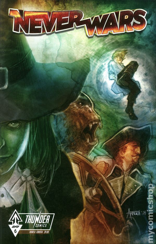 (W) Don Handfield, Tim Zajaros, Chris Lemole (A) Marcelo Basile (CA) Erwin J Arroza AMP Comics Presents: NeverWars #6. The vorpal blade has been stolen! As Georgie races against time to retrieve the only weapon that can destroy the Jabberwock, the beasts evil influence spreads across the NeverWorld. Captain Hook makes the ultimate sacrifice aboard the burning Jolly Roger, while Peter Pan must find the strength to fly once more. Meanwhile, Dorothy faces her greatest challenge yet as the Jabberwocks corruption threatens to consume everything she holds dear. In this pivotal issue, alliances will be tested, heroes will fall, and the fate of Neverland, Oz, Wonderland, and Fairyland hangs in the balance. When the final battle begins, not everyone will survive to see the end of this war. 32 pages, full color, not rated. Cover price $4.99.