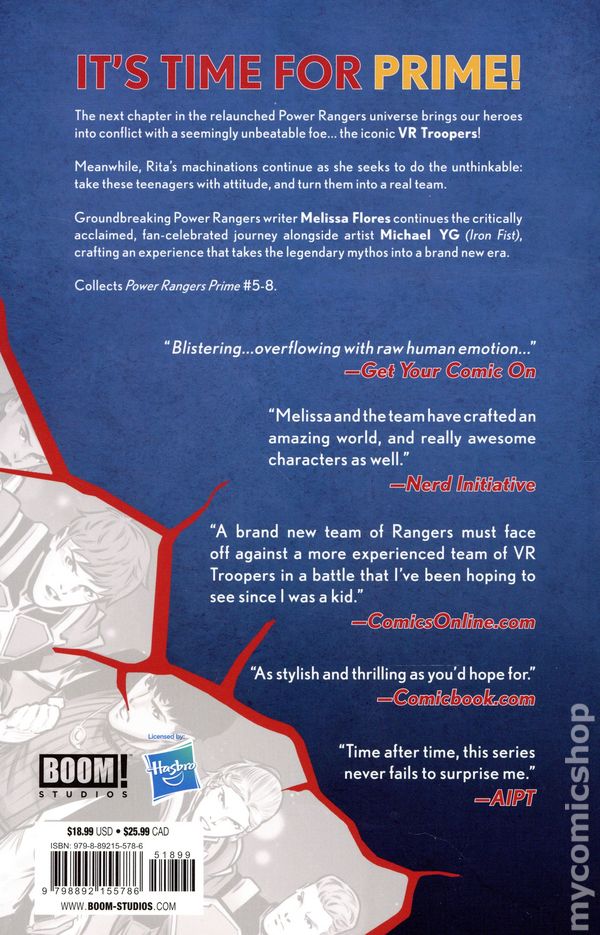 Volume 2 - 1st printing. Collects Power Rangers Prime (2024 Boom) #5-8. Written by Melissa Flores. Art by Michael Yg and Jo Mi-Gyeon. Cover by Dan Mora. The epic relaunch of the Power Rangers universe continues with a brand new story arc, pitting the new Rangers team against a fearsome enemy… the VR Troopers! IT'S TIME FOR PRIME! The next chapter in the relaunched Power Rangers universe brings our heroes into conflict with a seemingly unbeatable foe... the iconic VR Troopers! Meanwhile, Rita's machinations continue as she seeks to do the unthinkable: take these teenagers with attitude, and turn them into a real team. Groundbreaking Power Rangers writer Melissa Flores continues the critically acclaimed, fan celebrated journey alongside artist Michael YG (Iron Fist), crafting an experience that takes the legendary mythos into a brand new era. Softcover, 112 pages, full color. Cover price $18.99.