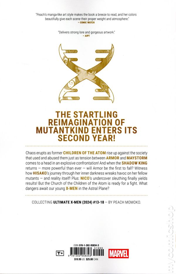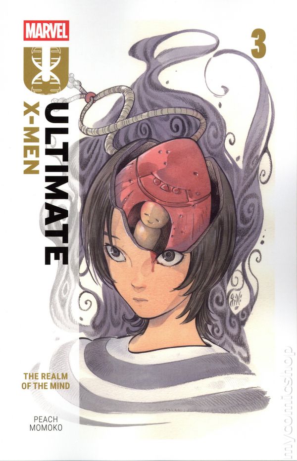 Volume 3 - 1st printing. "The Realm of the Mind!" Collects Ultimate X-Men (2024 Marvel) #13-18. Story and art by Peach Momoko. Visionary creator Peach Momoko's reimagination of mutantkind in the Ultimate Universe enters its second year! Chaos erupts as former Children of the Atom rise up against the society that used and abused them just as tension between Armor and Maystorm comes to a head in an explosive confrontation! And when the Shadow King returns — more powerful than ever — will Armor be the first to fall? Witness how Hisako's journey through her inner darkness wreaks havoc on her fellow mutants — and reality itself! Softcover, 152 pages, full color. Rated T+ Cover price $19.99.