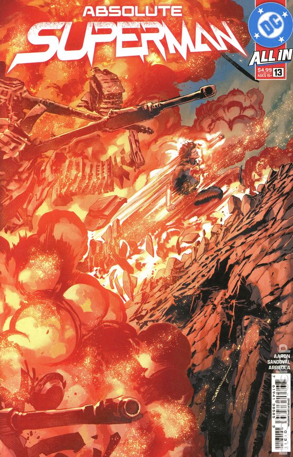 (W) Jason Aaron (A) Rafa Sandoval (CA) Rafa Sandoval THE BATTLE OF KANSAS BEGINS! The Battle of Kansas has begun as the tanks of Lazarus Corp come rolling down the streets of Smallville. Haunted and weakened from the horrors he suffered at the hands of Brainiac and Ras al Ghul, Superman wages a last desperate fight for everything and everyone he has come to hold dear! 32 pages, full color, rated 15+. Cover price $4.99.