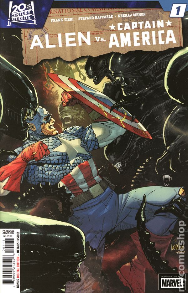 Limited 1 for 25 Retailer Incentive Variant Cover. (W) Frank Tieri (A) Stefano Raffaele (CA) Paulo Siqueira THE ZENOMORPH OF TRUTH? It's World War II and Hydra seeks a new weapon to defeat the Allies and win the war. To that end, the Red Skull has sent Baron Strucker on an expedition to the Himalayas to find the fabled city of Atilan. But instead of finding the Inhumans, Strucker uncovers something much more deadly. Much more... Alien. Can Captain America and the Howling Commandoes stop the Skull and his newfound xenomorph weapons... or will the First Avenger learn that in war-torn Europe... no one can hear you scream? RATED PARENTAL ADVISORY. Cover price $5.99.