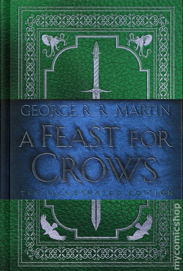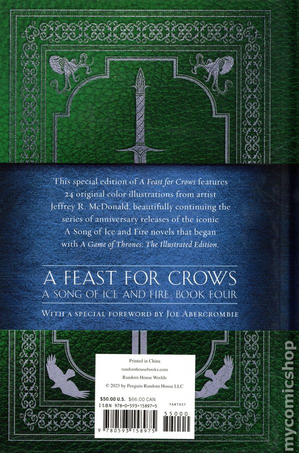 1st printing. By George R. R. Martin. Foreword by Joe Abercrombie. A magnificent illustrated edition of the fourth book in the beloved A Song of Ice and Fire series, for fans of HBO's Game of Thrones, published in celebration of the twentieth anniversary of the book. This special edition of A Feast for Crows features over twenty original color illustrations. This beautifully packaged book continues the series of anniversary releases of the iconic A Song of Ice and Fire novels that began with A Game of Thrones: The Illustrated Edition. WITH A SPECIAL FOREWORD BY JOE ABERCROMBIE. After centuries of bitter strife, the seven powers dividing the land have beaten one another into an uneasy truce. But its not long before the survivors, outlaws, renegades, and carrion eaters of the Seven Kingdoms gather. Now, as the human crows assemble over a banquet of ashes, daring new plots and dangerous new alliances are formed while surprising faces—some familiar, others only just appearing—emerge from an ominous twilight of past struggles and chaos to take up the challenges of the terrible times ahead. Nobles and commoners, soldiers and sorcerers, assassins and sages, are coming together to stake their fortunes . . . and their lives. For at a feast for crows, many are the guests—but only a few are the survivors. Hardcover, 6-in. x 9-in., 800 pages, Text (with B&W Chapter Illustrations and 24 full color Illustrations). Cover price $50.00.
