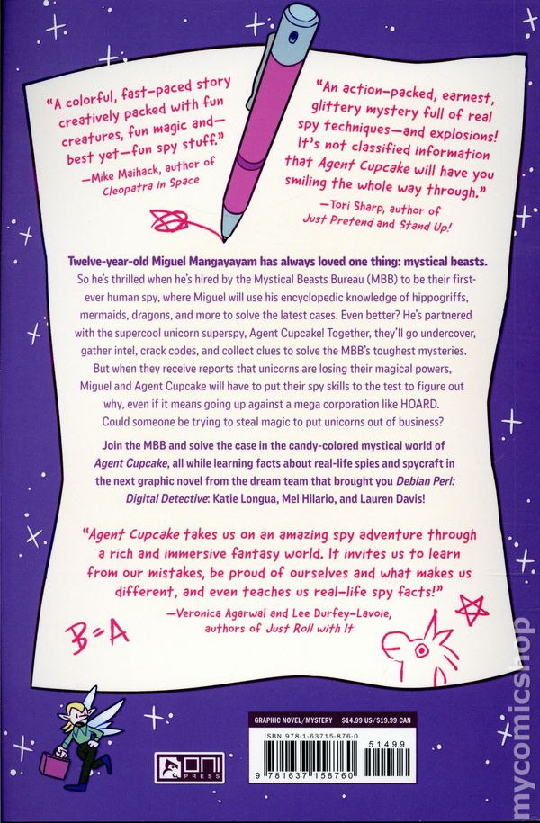 1st printing. Written by Lauren Davis and Mel Hilario. Art and cover by Katie Longua. Go undercover and crack the case in Agent Cupcake, perfect for fans of Mac B. Kid Spy and Spy School! Twelve-year-old Miguel Mangayayam has always loved one thing: mystical beasts. So hes thrilled when hes hired by the Mystical Beasts Bureau (MBB) to be their first ever human spy where hell use his encyclopedic knowledge of hippogriffs, mermaids, dragons, and more to solve the latest cases. Even better? Hes partnered with the supercool unicorn superspy, Agent Cupcake! Together, theyll go undercover, gather intel, crack codes, and collect clues to solve the MBBs toughest mysteries. But when they receive reports that unicorns are losing their magical powers, Miguel and Agent Cupcake will have to put their spy skills to the test to figure out why, even if it means going up against a mega corporation like HOARD. Could someone be trying to steal magic to put unicorns out of business? Join the MBB and solve the case in the candy-colored mystical world of Agent Cupcake, all while learning facts about real life spies and spycraft in the next graphic novel from the dream team that brought you Debian Perl: Digital Detective: Mel Hilario, Lauren Davis, and Katie Longua! Softcover, 6-in. x 9-in., 192 pages, full color. Cover price $14.99.