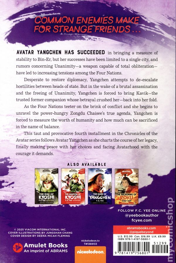 1st printing. By F C Yee and Michael Dante Dimartino. Cover by JungShan Chang. Avatar Yangchen has succeeded in bringing a measure of stability to Bin-Er, but her successes have been limited to a single city, and rumors concerning Unanimity-a weapon capable of total obliteration-have led to increasing tensions among the Four Nations. Desperate to restore diplomacy, Yangchen attempts to de-escalate hostilities between heads of state. But in the wake of a brutal assassination and the freeing of Unanimity, Yangchen is forced to bring Kavik-the trusted former companion whose betrayal crushed her-back into her fold. As the Four Nations teeter on the brink of conflict and she begins to unravel the power-hungry Zongdu Chaisee's true agenda, Yangchen is forced to measure the worth of humanity, and how much can be sacrificed in the name of balance. Softcover,5 1/2-in. x 8 1/2-in., 336 pages, Text. Cover price $12.99.