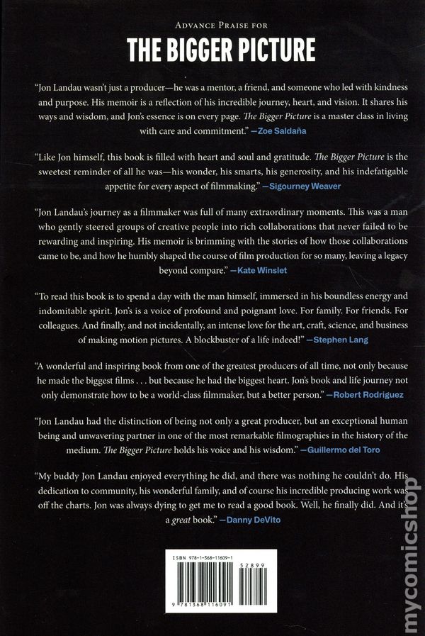 1st printing. By Jon Landau. Foreword by James Cameron. An uplifting and entertaining behind-the-scenes memoir about a life in film and the joy in solving problems with grace, kindness, and generosity, by the late film producer Jon Landau (Avatar, Titanic), written as he battled cancer and came to terms with his terminal diagnosis. Jon Landau, the Academy Award–winning film producer behind Titanic, Avatar, Alita: Battle Angel, Dick Tracy, and Honey, I Shrunk the Kids knew two things well: how to tell an unforgettable story and how to find solutions. So, when he found himself confronting his fate, a diagnosis of improbable odds, he began to problem solve, ensuring that everything he learned behind the camera would live on after he was gone. In his retrospective and advice-driven memoir, Landau shares behind-the-scenes stories about some of the greatest movies of our time and advice on how to live well while working in a notoriously all-consuming job by centering the things that mattered to him most—his love for his family and his dedication to his friends and creative partners—turning his own story into another blockbuster hit. The Bigger Picture is at once a deeply poignant memoir, a tribute to storytelling in its many forms, and a celebration of a life well lived, told from the third act. Imbued with Landaus trademark compassion, humanity, and humor, the stories he shares and the wisdom he imparts in The Bigger Picture will inspire, delight, and touch the hearts of readers for years to come. Hardcover, 6-in. x 9-in., 272 pages, Text Only. Cover price $28.99.