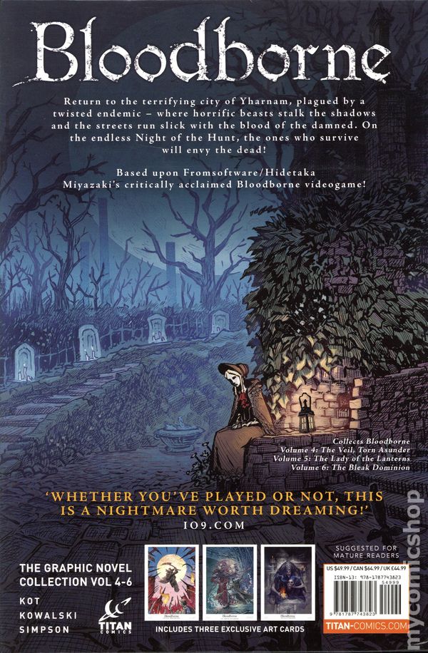 Set Includes 3 Volumes (with Slipcase) - Printings May Vary. Written by Ales Kot and Cullen Bunn. Art by Piotr Kowalski. Cover by Junggeun Yoon. COLLECTING THE NEXT THREE INSTALMENTS IN THE HIGHLY SUCCESSFUL BLOODBORNE VIDEOGAME ADAPTATIONS The incredible team of acclaimed horror writer Cullen Bunn and fan-favorite artist Piotr Kowalski return to continue the plight of the night of the hunt. Based on the world of the critically acclaimed Bloodborne videogame, this stunning graphic novel features delightfully horrific artwork of recognizable places and monsters. Collects Bloodborne: The Veil, Torn Asunder/The Lady of the Lanterns/The Bleak Dominion. Softcover (3 volumes with slipcase), 352 pages (Total), full color. Mature Readers Cover price $49.99.