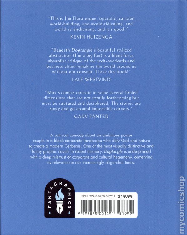 1st printing. Story and art by Max Huffman. Dogtangle opens with a town hall meeting in a Taco Bell nestled in the bland corporate environment of Business Park. A man, bleating to anyone who will listen about the evils of current zoning laws, meets a woman who works in pharmaceutical marketing. They begin a relationship. They get married. From their union springs the idea of the Hypermutt: a many-headed mass of dogs that absorbs each new dog it encounters. This debut graphic novel from Chicago cartoonist Max Huffman, about an awful power couple who defy God and nature in creating a hound of hell for our times, is at turns a rich satirical fable, a white-collar black comedy, and a stylistic tour de force blending elements of abstraction, cubism, mid-century modernism, and visual sight gags. One of the most visually distinctive and funny graphic novels in recent memory, Dogtangle is also underpinned with a deep mistrust of corporate and cultural hegemony, cementing its relevance in our increasingly oligarchal times. Hardcover, 5 1/2-in. x 7-in., 136 pages, PC. Mature Readers Cover price $19.99.