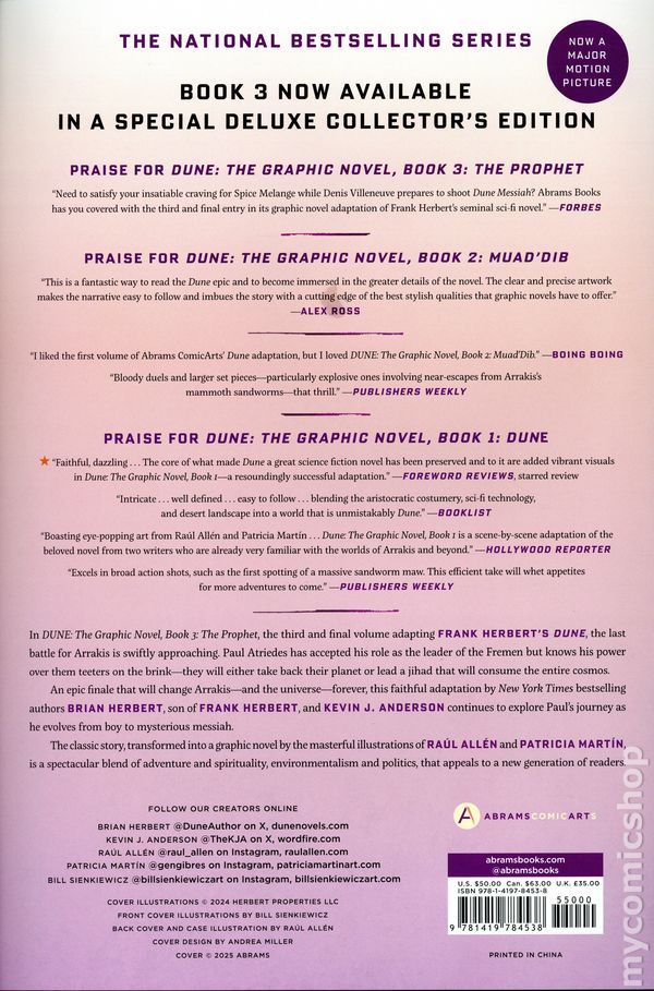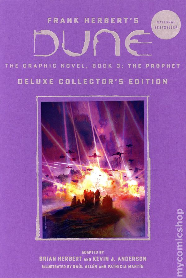 Volume 3 - 1st printing. "The Prophet!" Based on the story by Frank Herbert. Adapted by Brian Herbert and Kevin J. Anderson. Art by Raul Allen and Martín Patricia. Cover by Bill Sienkiewicz. spectacular deluxe edition of the third and concluding graphic novel adaptation of Dune, the groundbreaking science-fiction classic by Frank HerbertThis deluxe collectors edition features an increased trim size and is printed on high-quality matte art paper and packaged in a faux-cloth slipcase with foil stamping and a tip-on cover.In DUNE: The Graphic Novel, Book 3: Prophet, the third and final volume adapting Frank Herberts Dune, the final battle for Arrakis is swiftly approaching.Paul Atriedes has accepted his role as the leader of the Fremen but knows his power over them teeters on the brink—they will either take back their planet or lead a jihad that will consume the entire cosmos. Lady Jessica has become a Reverend Mother and must balance her support of her son with the expectations of the Bene Gesserit Order.Meanwhile, Baron Harkonnen has continued to groom his cunning nephew, Feyd-Rautha, to rule the desert planet. All their destinies collide in an epic finale that will change Arrakis—and the universe—forever.Brian Herbert, son of Frank Herbert, and New York Times bestselling author Kevin J. Anderson conclude their faithful adaptation of the novel Dune with Pauls manifestation of his great and terrible purpose. Once more illustrators Raúl Allén and Patricia Martín transport readers to the Dune universe in this visual masterpiece that blends classic science fiction with contemporary comics storytelling. Hardcover (Slipcase), 7 1/2-in. x 11 1/4-in., 208 pages, full color. Cover price $50.00.