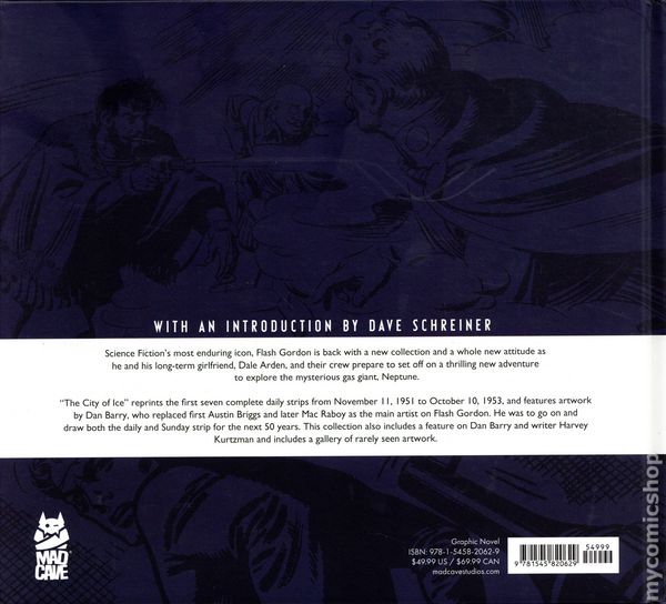 Volume 5 - 1st printing. "1951-1953!" Story and art by Dan Barry. Science Fictions most enduring icon, Flash Gordon is back with a new collection and a whole new attitude as he and his long-term girlfriend, Dale Arden, and their crew prepare to set off on a thrilling new adventure to explore the mysterious gas giant, Neptune. The City of Ice reprints the first seven complete daily strips from November 11, 1951 to October 10, 1953, and features artwork by Dan Barry, who replaced first Austin Briggs and later Mac Raboy as the main artist on Flash Gordon. He was to go on and draw both the daily and Sunday strip for the next 50 years. This collection also includes a feature on Dan Barry and writer Harvey Kurtzman and includes a gallery of rarely seen artwork. Hardcover, 11-in. x 10-in., 224 pages, full color. Cover price $49.99.