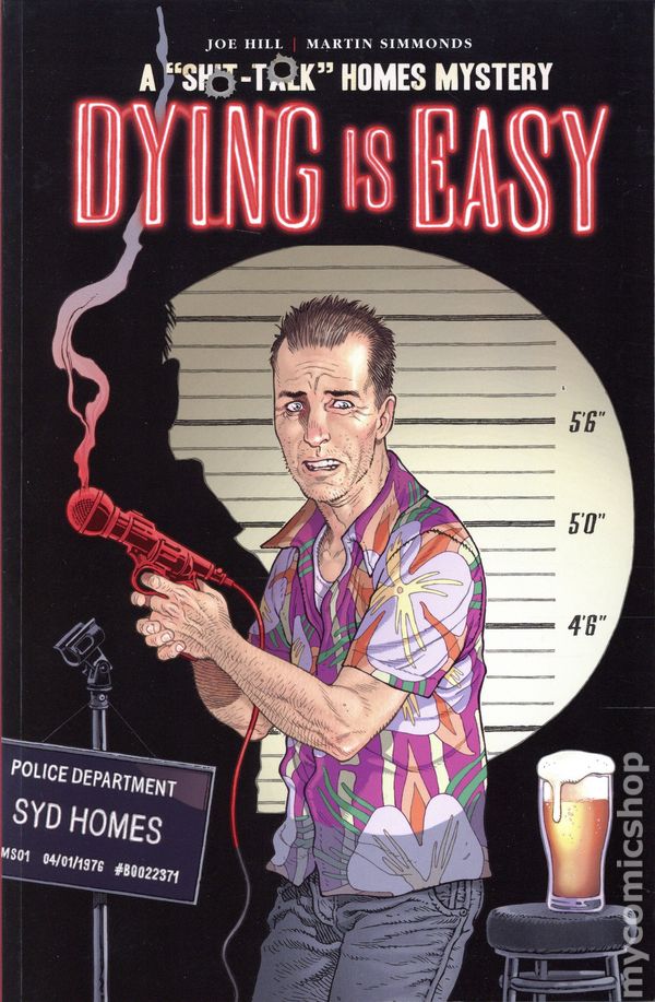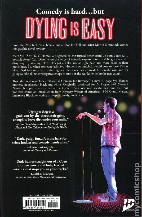 1st printing. Collects Dying is Easy (2019 IDW) #1-5. Written by Joe Hill. Art by Martin Simmonds. Cover by Gabriel Rodriguez. Back Cover by Martin Simmonds. Comedy is hard…but dying is easy! From the New York Times bestselling author of Locke & Key comes this graphic novel mystery! Meet Syd Sh*t-Talk Homes, a disgraced ex-cop turned bitter stand-up comic turned…possible felon? Carl Dixon is on the verge of comedy superstardom, and he got there the dirty way: by stealing jokes. Hes got a killer act, an ugly past, and more enemies than punchlines. So when someone asks Syd Homes how much it would cost to have Dixon killed, Syd isn't surprised in the slightest. But, once hes accused, hes on the run and its going to take all of his investigative chops to suss out the real killer before he gets caught. This crime thriller by writer Joe Hill and artist Martin Simmonds follows in the tradition of fair-play mysteries, inviting readers to solve the murder before Syd does! This edition also includes Rache is German for Revenge, a new, 11-page Syd Homes mystery, in glorious black-and-white. Originally produced for In League with Sherlock Holmes, it appears here as part of the Dying is Easy collection for the first time. Last but not least comes an introduction from Mystery Writers of Americas 1994 Grand Master, Lawrence Block, reflecting on cops, comedy, and crime. Softcover, 144 pages, full color. Cover price $17.99.