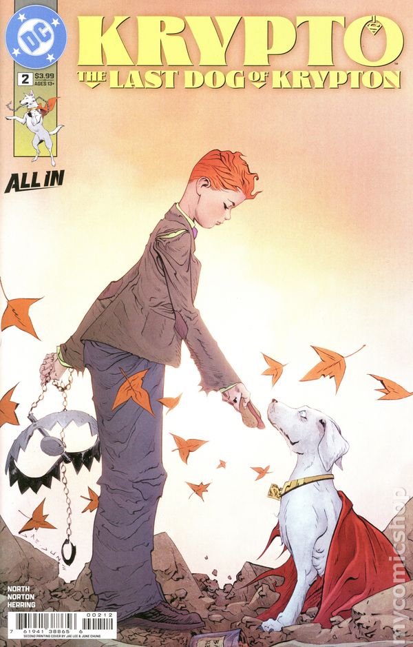2nd Printing. Written by Ryan North. Art by Mike Norton. Cover by Jae Lee, June Chung. ALL-STAR WRITER RYAN NORTH CRASH-LANDS KRYPTO ON EARTH! There will come a day when Krypto stands beside Superman, helping him fight off monsters, aliens, and supervillains--a day when this dog will save his adoptive world thanks to the incredible powers granted him by Earth's strange yellow sun. But he's not there yet. Today, Krypto is a normal puppy on Krypton, spending each happy, snoozy, endless day alongside his family: Jor-El, Lara, and baby Kal-El. But when a rocket test goes wrong, Krypto finds himself lost in space--and soon crash-landing, all alone, on a strange and alien world called Earth. 32 pages, full color. Rated T+ Cover price $3.99.