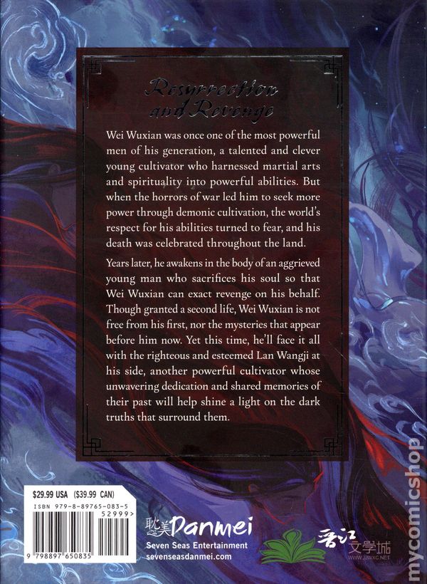 Volume 1 - 1st printing. Written by Mo Xiang Tong Xiu. Art by Marina Privalova. Bonus Illustration by moo. Cover by Ruthie. Translated by Suika. A beautiful hardcover edition of the New York Times Best Seller! The blockbuster danmei/Boys Love novels from China that inspired the comic, the animated series The Master of Diabolism, and the live-action series The Untamed: a historical fantasy tale of two powerful men who find each other through life and death. Wei Wuxian was once one of the most powerful men of his generation, a talented and clever young cultivator who harnessed martial arts and spirituality into powerful abilities. But when the horrors of war led him to seek more power through demonic cultivation, the world's respect for his abilities turned to fear, and his death was celebrated throughout the land. Years later, he awakens in the body of an aggrieved young man who sacrifices his soul so that Wei Wuxian can exact revenge on his behalf. Though granted a second life, Wei Wuxian is not free from his first, nor the mysteries that appear before him now. Yet this time, he'll face it all with the righteous and esteemed Lan Wangji at his side, another powerful cultivator whose unwavering dedication and shared memories of their past will help shine a light on the dark truths that surround them. Hardcover, 6-in. x 8 1/2-in., 396 pages, Text. Cover price $29.99.