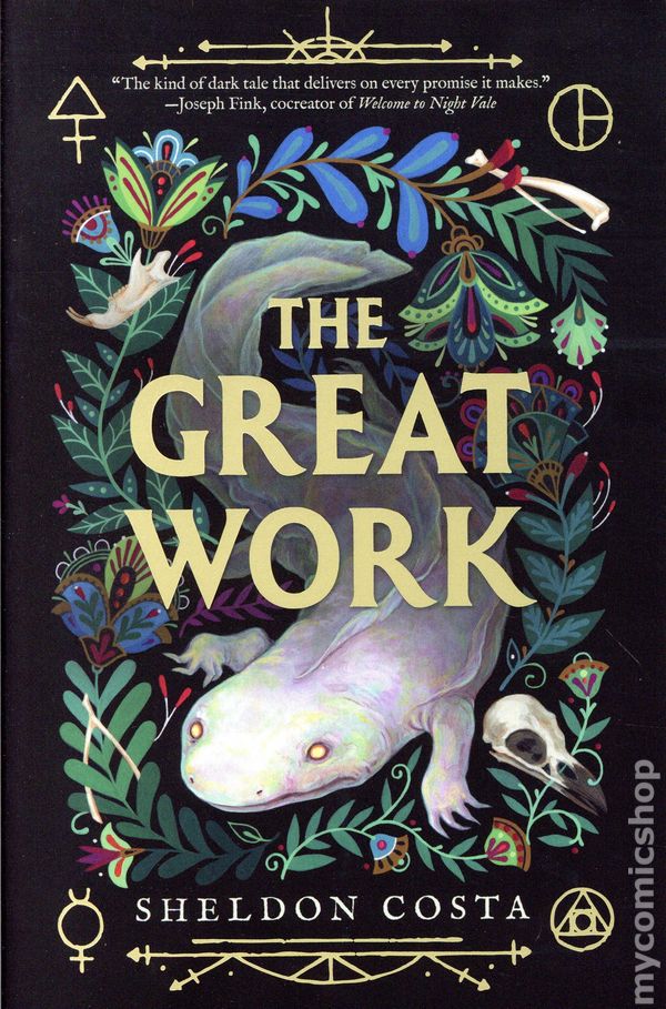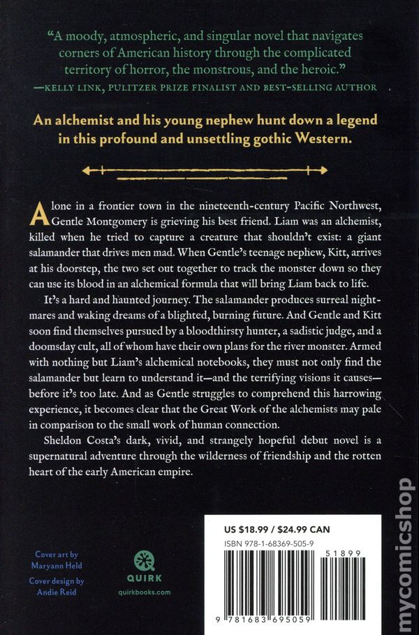 1st printing. By Sheldon Costa. Cover by Maryann Held. An alchemist and his teenage nephew hunt down a legend in this profound and unsettling speculative Western, for fans of Karen Russell and Victor LaValle. Alone in a frontier town in the nineteenth-century Pacific Northwest, Gentle Montgomery is grieving his best friend. Liam was an alchemist, killed when he tried to capture a creature that shouldnt exist: a giant salamander that drives men mad. When Gentles nephew, Kitt, arrives at his doorstep, the two set out together to track the monster down so they can use its blood in an alchemical formula that will bring Liam back to life. Its a hard and haunted journey. The salamander produces surreal nightmares and waking dreams of a blighted, burning future. And Gentle and Kitt soon find themselves pursued by a bloodthirsty hunter, a sadistic judge, and a doomsday cult, all of whom have their own plans for the river monster. Armed with nothing but Liams alchemical notebooks, they must not only find the salamander but learn to understand it—and the terrifying visions it causes—before its too late. And as Gentle struggles to comprehend this harrowing experience, it becomes clear that the Great Work of the alchemists may pale in comparison to the small work of human connection. Sheldon Costas dark, vivid, and strangely hopeful debut novel is a supernatural adventure through the wilderness of friendship and the rotten heart of the early American empire. Softcover, 5-in. x 8-in., 336 pages, Text Only. Cover price $18.99.