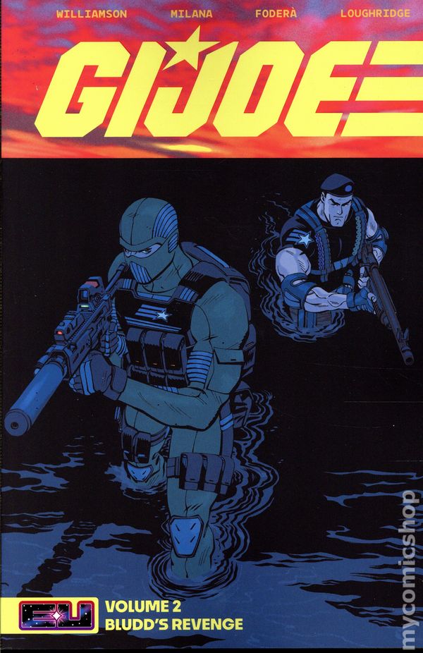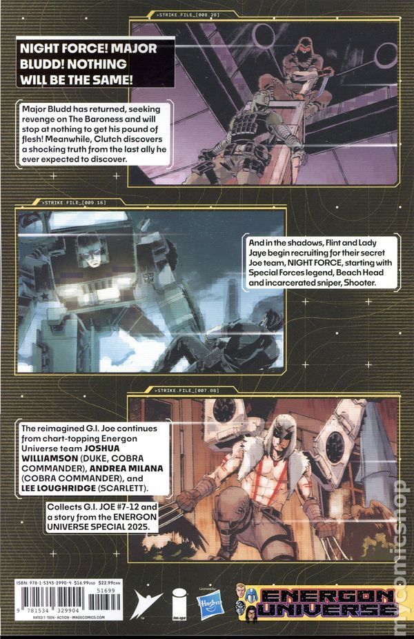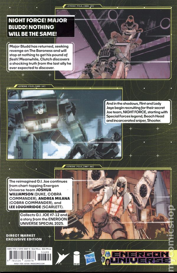 Volume 2 - 1st printing. "Bludd's Revenge!" Collects GI Joe (2024 Image) #7-12. Written by Joshua Williamson. Art by Andrea Milana and Marco Fodera. Cover by Tom Reilly. Back Cover by Andrea Milana. NIGHT FORCE! MAJOR BLUDD! NOTHING WILL BE THE SAME! Major Bludd has returned for revenge on The Baroness—but can anything stand in his way? Meanwhile, Clutch discovers a shocking truth from the last ally he ever expected to discover. And Flint and Lady Jaye begin recruiting for their secret Joes team, NIGHT FORCE, starting with Special Forces legend, Beach Head. Find out in the hottest comic book of the decade from chart-topping Energon Universe team Joshua Williamson (Duke, Cobra Commander), Andrea Milana (Cobra Commander), and Lee Loughridge (Scarlett). Softcover, 136 pages, full color. Teen Cover price $16.99.