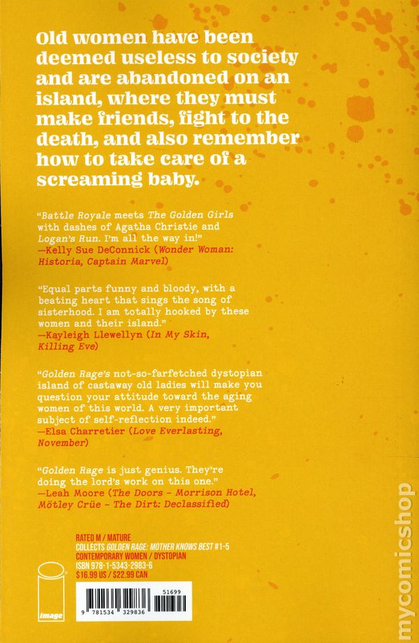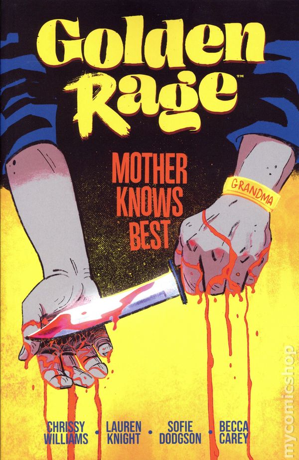 Volume 2 - 1st printing. Collects Golden Rage: Mother Knows Best (2025 Image) #1-5. Written by Chrissy Williams. Art and Cover by Lauren Knight. In a world where old and infertile women are deemed useless to society and abandoned on an island, GOLDEN RAGE documents their golden years of making friends, baking dessert, and fighting to the death. MOTHER KNOWS BEST builds on the first GOLDEN RAGE volume for a glorious new adventure. Created by writer CHRISSY WILLIAMS (editor of DIE, THE WICKED + THE DIVINE), artist LAUREN KNIGHT (Buffy the Vampire Slayer), and interiors colorist SOFIE DODGSON (BITTER ROOT, Tank Girl), this is the FIRST ISSUE of a brand-new five-issue miniseries where Battle Royale meets The Golden Girls. Softcover, 152 pages, full color. Mature Readers Cover price $16.99.