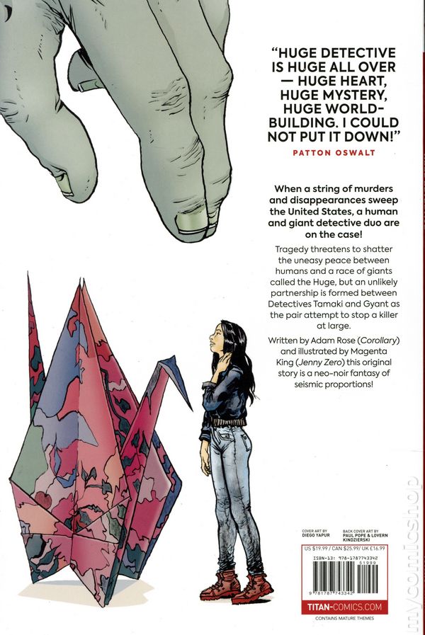 1st printing. Collects Huge Detective (2024 Titan) #1-5. Written by Adam Rose. Art by Magenta King. Cover by Paul Pope. Diego Yapur CHINATOWN MEETS THE BFG! When A STRING OF MURDERS and disappearances sweep the United States, a human and a giant WITH SIZABLE DETECTIVE SKILLS are on the case! After a race of giants emerged from deep sleep beneath the earth, a bloody conflict ensued in what became known as THE OMEGA EVENT. Eventually, a treaty is resolved and state of Brobdingnag is created, allowing humans and giants to co-exist harmoniously. Yet tragedy threatens to shatter the peace, and an unlikely partnership is formed between Detectives Tamaki and GYANT. As the pair attempt to stop the criminal AT LARGE, they find themselves involved in a mystery BIGGER than either could imagine. Softcover, 128 pages, full color. Teen+ Cover price $19.99.