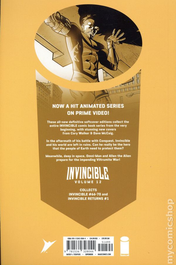 2nd Edition - Volume 12 - 1st printing. Collects Invincible (2003) #66-70 and Invincible Returns (2010 Image). Written by Robert Kirkman. Art by Ryan Ottley and Cliff Rathburn. Cover by Cory Walker. NOW A HIT ANIMATED SERIES ON PRIME VIDEO! These all-new definitive softcover editions collect the entire INVINCIBLE comic book series from the very beginning, with stunning new covers from Cory Walker and Dave McCaig. In the aftermath of his battle with Conquest, Invincible and his world are left in ruins. Can he really be the hero that the people Earth need to protect them? Meanwhile, deep in space, Omni-Man and Allen the Alien prepare for the impending Viltrumite War! Softcover, 152 pages, full color. Cover price $14.99.