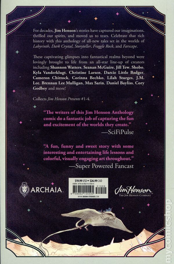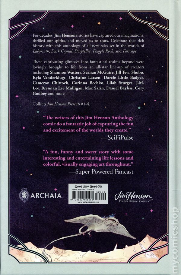 1st printing. Collects Jim Henson Presents (2024 Boom) #1-4. 1st printing. Collects Jim Henson Presents (2024 Boom) #1-4. Written by Seanan McGuire, Shannon Watters, Jill Tew, Shobo, Kyla Vanderklugt, Christine Larsen, J.M. Lee, Corinna Bechko, Lilah Sturges, Cameron Chittock, Megan Brown, and Darcie Little Badger. Art by Countandra, Max Sarin, Carola Borelli, V.V. Glass, Kyla Vanderklugt, Christine Larsen, Nori Retherford, Ornella Greco, Elizabeth Torque, Cory Godbey, Jared Cullum, Simona di Gianfelice. Cover by Lisa Sterle. An all-star line-up of creators bring to life an anthology of new stories set in the imaginative worlds of Jim Henson, including Labyrinth, Dark Crystal, Storyteller, Fraggle Rock, and Farscape. For decades, Jim Henson's stories have captured our imaginations, thrilled our spirits, and moved us to tears. Celebrate that rich history with this anthology of all-new tales set in the worlds of Labyrinth, Dark Crystal, Storyteller, Fraggle Rock, and Farscape. These captivating glimpses into fantastical realms beyond were lovingly brought to life from an all-star line-up of creators including Shannon Watters, Aabria Iyengar, Seanan McGuire, Jill Tew, Shobo, Kyla Vanderklugt, Christine Larsen, Darcie Little Badger, Cameron Chittock, Corinna Bechko, Lilah Sturges, J.M. Lee, Brennan Lee Mulligan, Max Sarin, Daniel Bayliss, Cory Godbey and more! Softcover, 176 pages, full color. Age 16 and up Cover price $19.99.