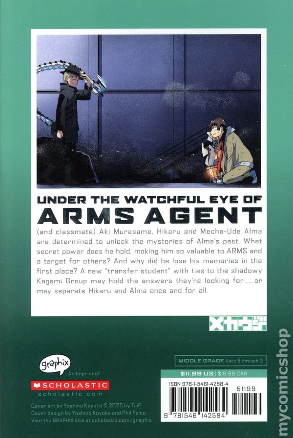 Volume 2 - 1st printing. Story and art by Yoshino Koyoka. The action continues in volume 2! An ordinary middle-school student's life takes a thrilling turn when he encounters a powerful mechanical being in this exciting new manga series for fans of My Hero Academia and Spy x Family. Kita-Kagami City is a pretty normal town… except that some people have gotten their hands on Mecha-Ude: powerful, sentient, mechanical beings that attach themselves to their human hosts and have awesome capabilities. When middle-school kid Hikaru accidentally activates Alma, a robotic arm Mecha-Ude that has no memory of its past, they form an unlikely bond. But where did Alma come from? And why are shadowy secret organizations suddenly chasing Hikaru, stopping at nothing to steal Alma? Together, Hikaru and Alma must uncover the truth behind the Mecha-Udes identity and prevent it from ending up in the wrong hands. Softcover, 5 1/2-in. x 7-in., 208 pages, full color. Middle Grade Cover price $11.99.