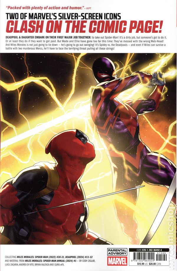 1st printing. Collects Miles Morales: Spider-Man (2023 Marvel) #30-31, Deadpool (2024 Marvel) #11-12, and a Story from Miles Morales: Spider-Man (2023 Marvel) Annual #1. Written by Cody Ziglar. Art by David Baldeon, Andrea Di Vito, and Luigi Zagaria. Cover by Federico Vicentini. Back Cover by Taurin Clarke. Deadpool and Spider-Man have teamed up time and again...but that was Peter Parker. This, time it's Miles Morales that Deadpool gets tangled with, as two of Marvels silver-screen icons clash on the comic-book page! Deadpool & Daughter embark on their first major assignment: to take out Spider-Man! Its a dirty job, but someones got to do it. Or at least they do if they want to get paid. But Wade and Ellie Wilson have gone too far this time: Theyve messed with the wrong web-head! And Miles Morales is not just going to lie down — hes going to go out swinging! Its Spidey vs. the Deadpool's — and even if Miles can survive a battle with two murderous Mercs, hell have to face the terrifying threat pulling all these strings! Softcover, 112 pages, full color. Rated T+ Cover price $15.99.