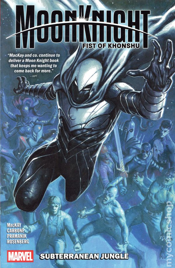 Volume 2 - 1st printing. "Subterranean Jungle!" Collects Moon Knight: Fist of Khonshu (2024 Marvel) #6-10. Written by Jed MacKay. Art by Domenico Carbone and Devmalya Pramanik. Cover by Davide Paratore. The latest chapter in Jed MacKay's Moon Knight epic continues, with the return to life of Marc Spector, the original Moon Knight! Moon Knight has failed! With blood on his hands and a fractured team, Marc Spector faces a sort of confessional with his god Khonshu — whos known less for his forgiveness and more for his vengeance! Against a backdrop of turmoil, 8-Ball finds a new crew. But who or what is the Pool Party?! Wounded and with his alliances hanging by a thread, will 8-Ball do the unthinkable and return to a life of crime? Plus: Wielding a sword from Vanaheim and with an ax to grind comes Carver, righthand woman of Achilles Fairchild! Moon Knights already gotten stomped by Fairchild himself and only lived by the grace of Khonshu! But the Moon Gods patience is wearing thin, and Carvers blade craves blood! Softcover, 128 pages, full color. Rated T+ Cover price $17.99.