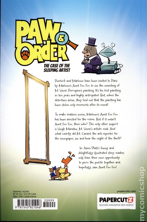 Volume 2 - 1st printing. "The Case of the Sleeping Artist!" Story and art by Jason Platt. Purrlock and Marlowe have been invited to Paris by Marlowes Aunt Foo Foo to see the unveiling of M. Henri Porcupines painting. Its his first painting in ten years and highly anticipated. But, when the detectives arrive, they find out that the painting has been stolen only moments after its reveal! To make matters worse, Marlowes Aunt Foo Foo has been arrested for the crime. But if it wasnt Aunt Foo Foo, then who? The only other suspect is Hugh Manatee, M. Henris artistic rival. And what exactly did M. Canard, the arts reporter for the newspaper, see and hear the night of the theft? In Jason Platts funny and delightfully illustrated story, readers will have their own opportunity to piece the puzzle together and, hopefully, save Aunt Foo Foo! Softcover, 6-in. x 9-in., 88 pages, full color. All Ages Cover price $9.99.