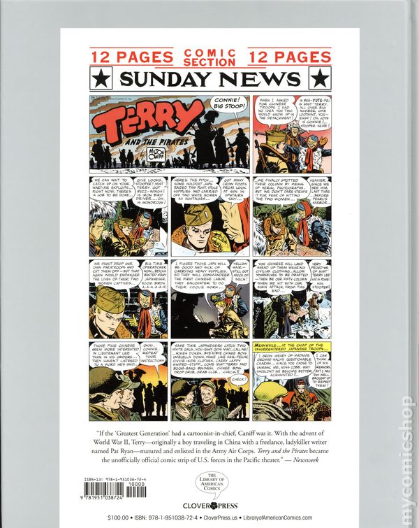 Volume 12 - 1st printing. "1946: Ring Out the Old!" Story and art by Milton Caniff. If the Greatest Generation had a cartoonist-in-chief, Caniff was it. With the advent of World War II, Terry —originally a boy traveling in China…matured and enlisted in the Army Air Corps. Terry and the Pirates became the unofficially official comic strip of U.S. forces in the Pacific theater. — NewsweekThe saga continues in Terry and the Pirates Volume 12, reproduced from Milton Caniff's personal set of color syndicate tabloid proofs! In this final volume Milton Caniff gives curtain calls to many of his vivid, colorful characters. Readers will be sometimes delighted, sometimes shocked by their last visits with Terry, Pat, Connie, Big Stoop, the Dragon Lady, Burma, Hotshot Charlie, Jane Allen, Deeth Crispin III, Chopstick Joe, Tony Sandhurst, Baron DePlexus, Capn Blaze, and others. Its time to ring out the old and ring in the new in Caniffs classic Terry and the Pirates conclusion! This tabloid-sized Volume 12 containing the 1946 dailies and Sundays is an unparalleled upgrade that no Terry fan can afford to pass up. Hardcover, 11-in. x 14-in., 164 pages, full color. Cover price $100.00.