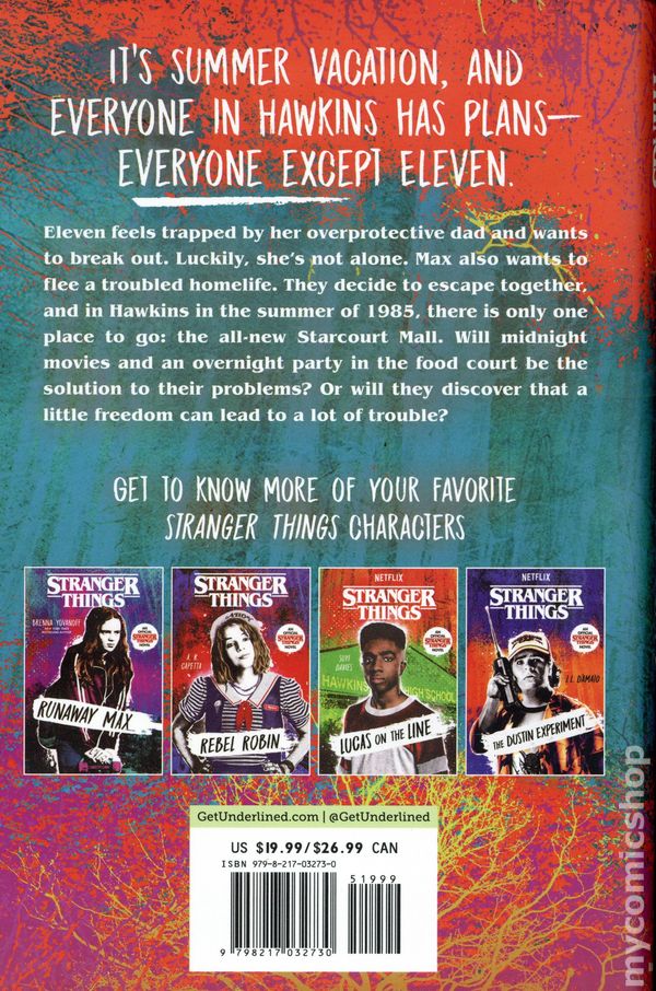 1st printing. By Jennifer Brody. Cover by Ian Keltie. Explore Hawkins with fan-favorite character Eleven in a novel based on the iconic Netflix series Stranger Things. Its summer vacation, and everyone in Hawkins has plans—everyone except Eleven. She feels trapped by her overprotective father and wants to break out and find a normal teen life like she sees in her magazines. Luckily, Elevens not alone. Her friend Max needs to flee a troubling home life and an increasingly dangerous older brother. They decide to escape together, and in Hawkins in the summer of 1985, there is only one place to go: the all-new Starcourt Mall. Will midnight movies and an overnight party in the food court be the solution to their problems? Or will Eleven and Max discover that a little freedom can lead to a lot of trouble, and that the ghosts of the past are never far away? Filled with details from Netflix's series Stranger Things, this novel explores Hawkins—and Elevens place in it—like never before. Hardcover, 5-in. x 8-in., 320 pages, Text Only. Cover price $19.99.