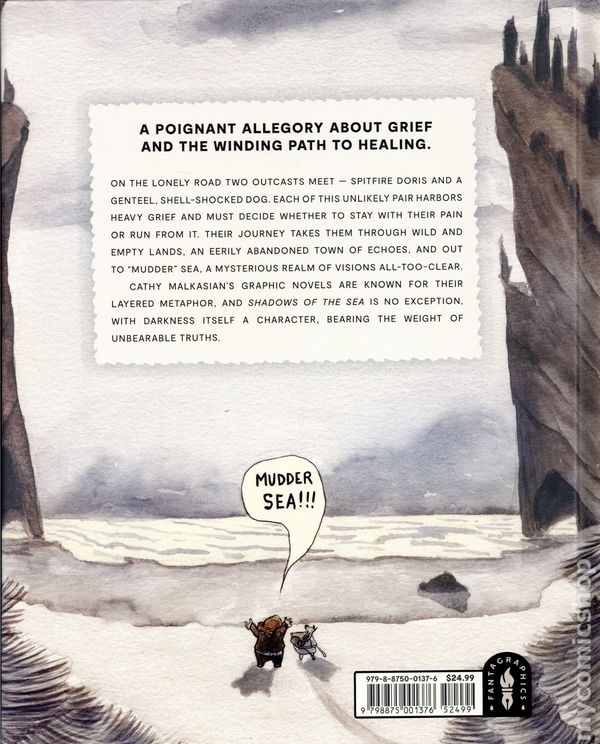 1st printing. Story and art by Cathy Malkasian. On the lonely road meet two outcasts — Doris, a small but spitfire woman and Stanwick, a shy and sensitive dog. Each of this unlikely pair harbors grief, and must decide whether to stay with the pain or run from it. On their journey, the two travel through lush forests, to the eerily abandoned town of echoes, clear to the mudder sea, where they finally confront the unbearable trauma of their pasts. Cartoonist Cathy Malkasians graphic novels are known to be crafted with layered, affecting allegory and metaphor, and Shadows of the Sea is no exception. In this story, shadows become characters themselves, weighed down with painful truth. They cannot be released until their owners acknowledge, reflect, and heal. Charged by the magic of the mudder sea, the shadows reveal the loss Doris and Stanwick have been carrying — a husband and a child — and sets them free at last. Hardcover, 8-in.x 10 1/2-in., 168 pages, B&W. Mature Readers Cover price $24.99.