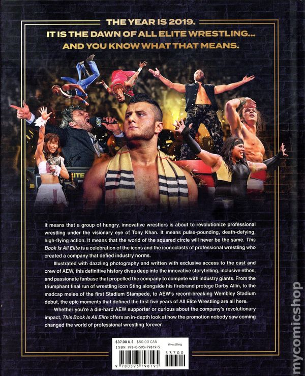 1st printing. By Keith Elliot Greenberg. Score a front-row seat for the thrilling story of the icons and iconoclasts that revolutionized professional wrestling, packed with exclusive interviews and explosive action shots of your favorite stars. The year is 2019. It is the dawn of All Elite Wrestling . . . and you know what that means. It means that a group of hungry, innovative wrestlers are about to revolutionize professional wrestling under the visionary eye of Tony Khan. It means pulse-pounding, death-defying, high-flying action. It means that the world of the squared circle will never be the same. Jam-packed with dazzling photography and written with exclusive access to the cast and crew of AEW, this definitive history dives deep into the innovative storytelling, inclusive ethos, and passionate fanbase which propelled the company to compete with industry giants. From the triumphant final run of the icon Sting alongside his firebrand protégé Darby Allin, to the madcap melee of the first Stadium Stampede, to AEWs record-breaking Wembley Stadium debut, the epic moments that defined the first five years of All Elite Wrestling are all here. Whether youre a die-hard AEW supporter or curious about the companys revolutionary impact, This Book is All Elite offers an in-depth look at how the promotion nobody saw coming changed the world of professional wrestling forever. Hardcover, 8-in. x 10-in., 224 pages, full color. Cover price $37.00.