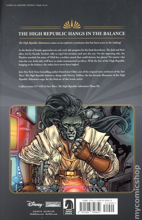 Volume 5 - 1st printing. Collects Star Wars: The High Republic Adventures - Phase III (2023 Dark Horse) #17-20. Written by Daniel José Older. Art by Harvey Tolibao, Elisa Romboli, Corni Howell, Diana Sousa, French Carlomagno, Elizabeth Beals, and Daniel Jose Older. Cover by Harvey Tolibao. Collects the thrilling final arc of the High Republic Adventures Phase III, detailing the Jedis final battle with the villainous Nihil for the fate of the High Republic! The High Republic Adventures comes to an explosive conclusion that has been years in the making! As the Battle of Eriadu approaches its end, each side prepares for the final fight. The Jedi and their allies, led by Farzala Tarabal, rally to repel the invaders and save the city. On the opposing side, the Warden marshals his army of Nihil for a reckless attack that could destroy the planet! No matter who wins the war, both sides will have to make monumental sacrifices. With the fate of the High Republic hanging in the balance, the stakes have never been higher! Join New York Times bestselling author Daniel José Older, one of the original story architects of the Star Wars: The High Republic initiative, along with Harvey Tolibao, the fan-favorite illustrator of the High Republic Adventures saga, for the final arc of this iconic series! Softcover, 104 pages, full color. Cover price $19.99.