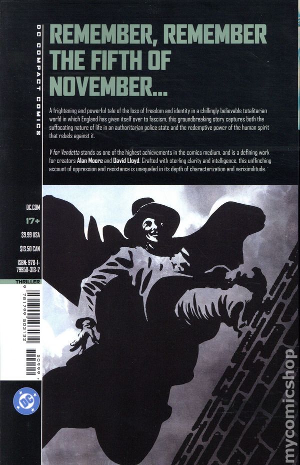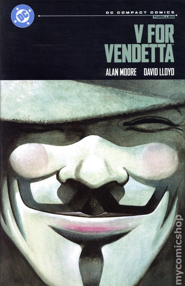 1st printing. Collects V for Vendetta (1988) #1-10. Written by Alan Moore. Art and Cover by David Lloyd. ALAN MOORE AND DAVID LLOYD'S GROUNDBREAKING CLASSIC COMES TO COMPACT COMICS! A frightening and powerful tale of the loss of freedom and identity in a chillingly believable totalitarian world in which England has given itself over to fascism, this groundbreaking story captures both the suffocating nature of life in an authoritarian police state and the redemptive power of the human spirit that rebels against it. V FOR VENDETTA stands as one of the highest achievements in the comics medium and is a defining work for creators Alan Moore and David Lloyd. Crafted with sterling clarity and intelligence, this unflinching account of oppression and resistance is unequaled in its depth of characterization and verisimilitude. Softcover, 5 1/2-in.x 8 1/2-in., 368 pages, full color. Mature Readers Cover price $9.99.